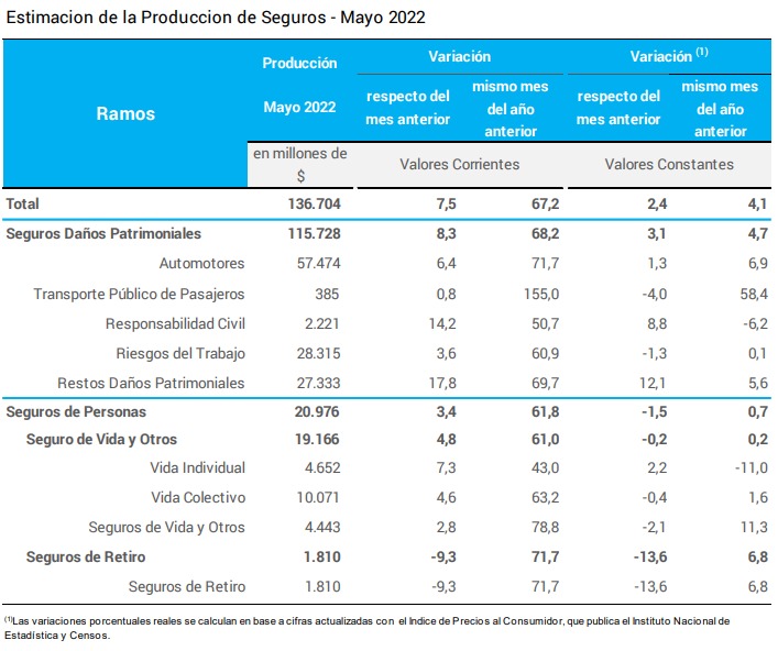 La estimación de la Producción Total de Seguros para el mes de mayo de 2022 fue de 136.704 Millones de pesos, de los cuales el 84,7 % corresponde a los Seguros Patrimoniales, el 14 % a los Seguros de Vida y el 1,3 % a los Seguros de Retiro.
