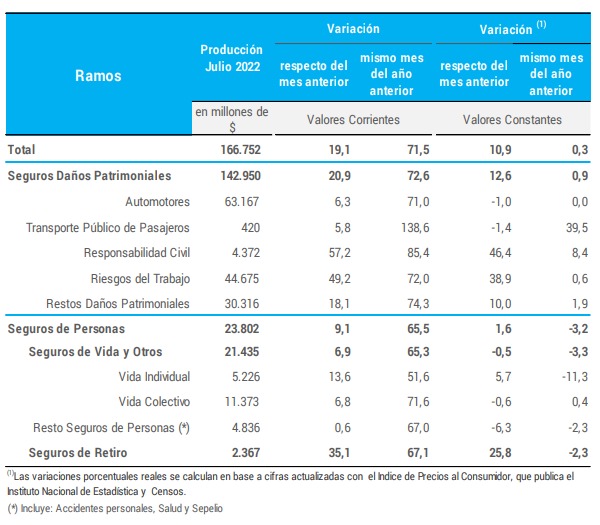 La estimación de la Producción Total de Seguros para el mes de julio de 2022 fue de 16.752 millones de pesos, de los cuales el 82,8 % corresponde a los Seguros Patrimoniales, el 15,7 % a los Seguros de Vida y el 1,5 % a los Seguros de Retiro. Dicha cifra indica a valores corrientes, un incremento del 19,1 % con respecto al mes de junio, es un 72,6 % superior contra el mismo mes del año anterior.