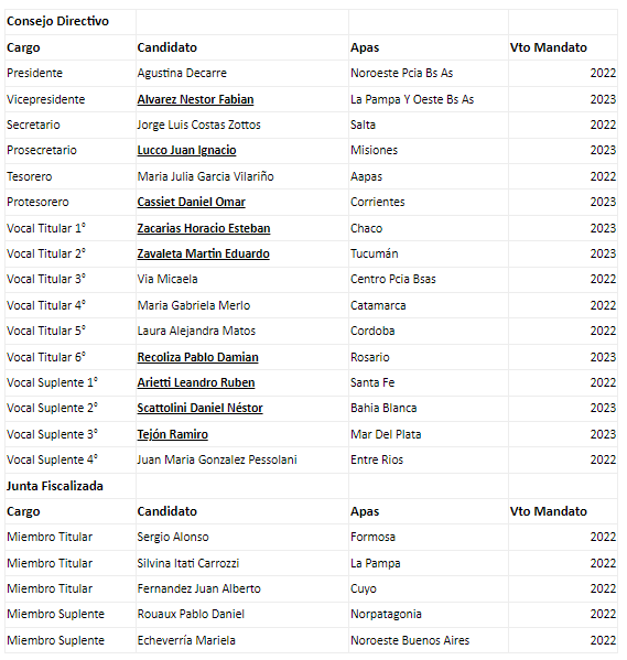 Los PAS electos en la jornada son: como Vicepresidente, Néstor Fabian Alvarez (La Pampa y Oeste Bs. As.); como Prosecretario, Juan Ignacio Lucco (Misiones); como Protesorero, Daniel Omar Cassiet (Corrientes); y los vocales Horacio Esteban Zacarias (Chaco), Martin Eduardo Zavaleta (Tucumán), Pablo Damian Recoliza (Rosario), Leandro Ruben Arietti (Santa Fe), Daniel Néstor Scattolini (Bahía Blanca) y Ramiro Tejón (Mar Del Plata).