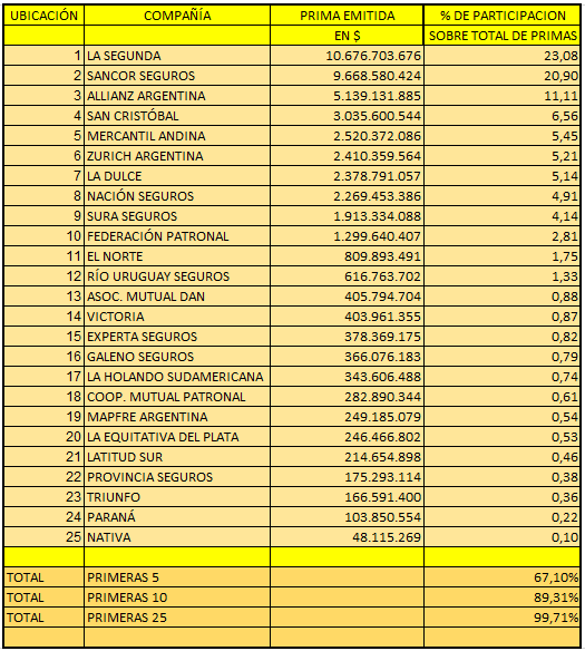 Si tomamos en consideración las 10 primeras aseguradoras el porcentaje alcanza al 89,31 % y si ampliamos la participación de las primeras 25 las mismas alcanzan el 99,71 % del total de la producción.
