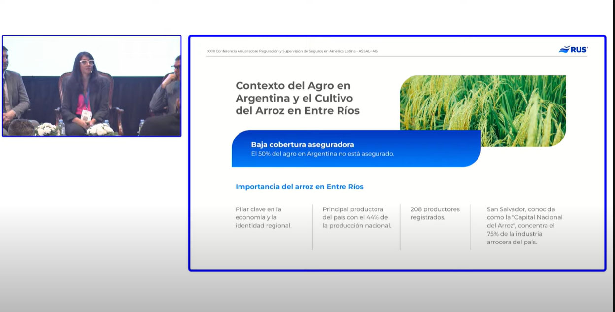 Gómez se refirió a los seguros paramétricos que RUS está desarrollando con el fin de proteger la producción arrocera ante diferentes riesgos climáticos, cuya primera fase de implementación se plantea realizar en el Departamento de San Salvador, Entre Ríos, conocido como la "Capital Nacional del Arroz", ya que concentra el 75% de la industria arrocera del país.