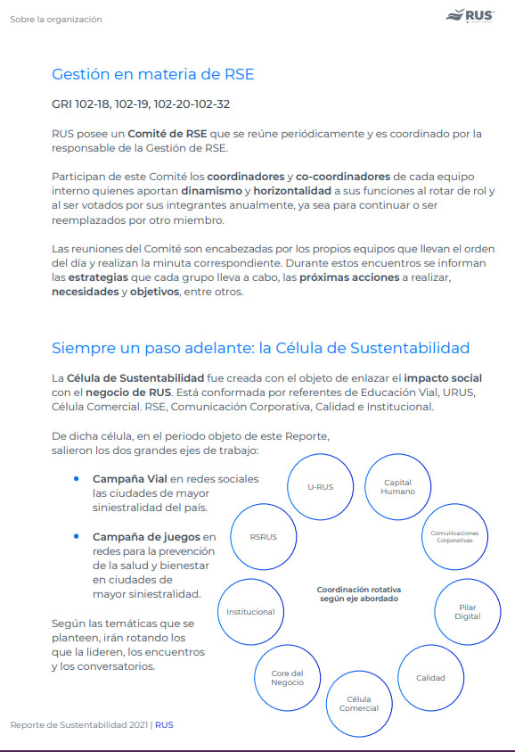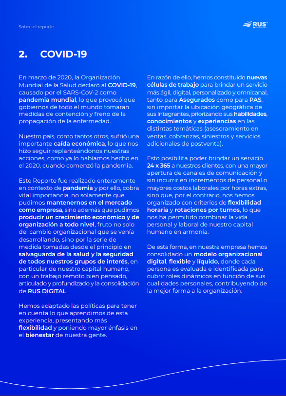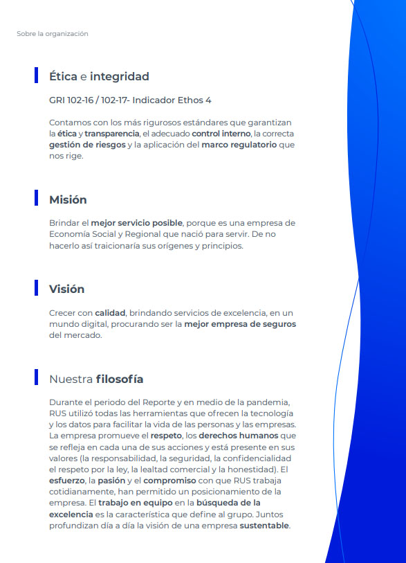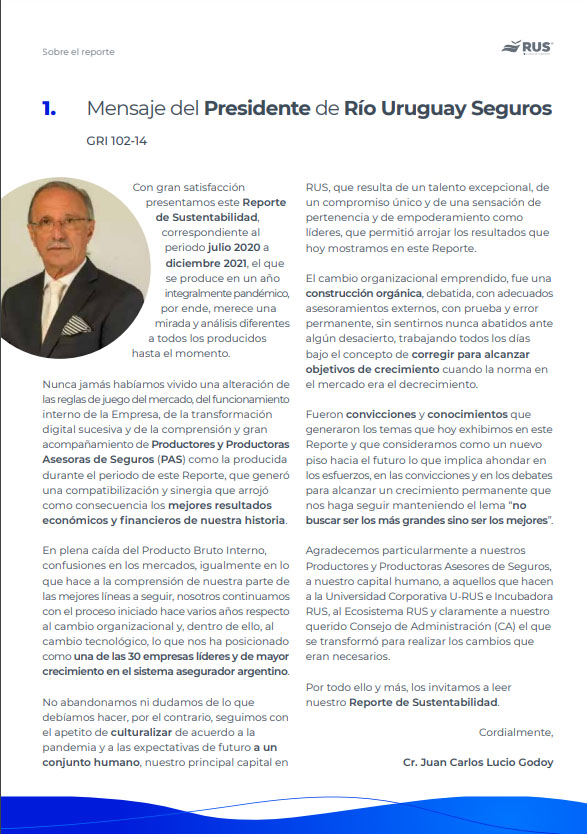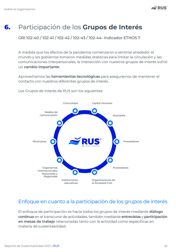 Río Uruguay Seguros (RUS) presentó su Reporte de Sustentabilidad correspondiente al período julio 2020 – diciembre 2021, ante el Pacto Global de Naciones Unidas. En el mismo se detallan todas las acciones que la empresa cooperativa realizó en materia ambiental, económica, social, el trabajo durante la pandemia, la reestructuración y cultura organizacional, entre otros enfoques. El Reporte fue confeccionado bajo los lineamientos de la Global Reporting Initiative (GRI), afianzando la integración con los Objetivos de Desarrollo Sostenible (ODS), localizando los Indicadores ETHOS – IARSE para negocios sustentables y responsables.