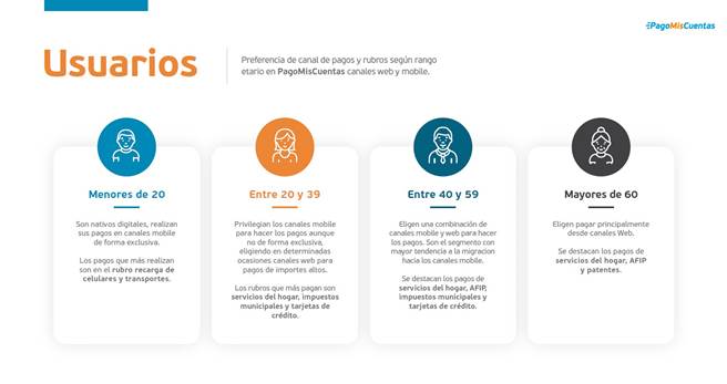 Los usuarios entre 40 y 59 años combinan los canales mobile y web y es el segmento con mayor tendencia a migrar sus pagos con el celular. Se destacan pagos de servicios del hogar, AFIP, impuestos municipales y tarjetas de crédito.