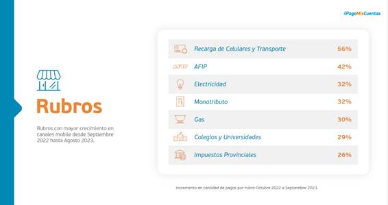 Para finalizar el análisis, los rubros con mayor crecimiento en canales mobile en el último año son recarga de celulares y transporte con un crecimiento de 56%, AFIP con 42% y electricidad y el pago de Monotributo con 32%. Le siguen gas con 30%, colegios y universidades con 29% e impuestos provinciales con 26%.