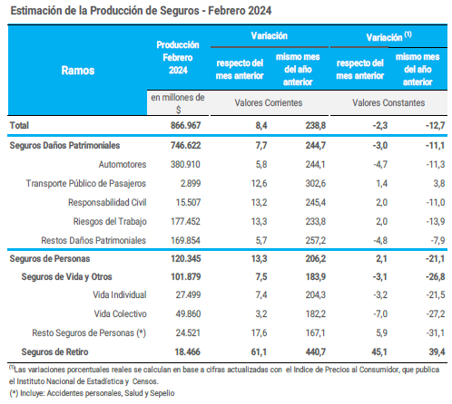 La estimación de la Producción Total de Seguros para el mes de Marzo 2024 fue de 866.967 Millones de pesos, de los cuales el 86,1% corresponde a los Seguros Patrimoniales, el 11,8% a los Seguros de Vida y Otros (Vida Individual/Colectivo y resto Seguros de Personas), y el 2,1% a los Seguros de Retiro.
