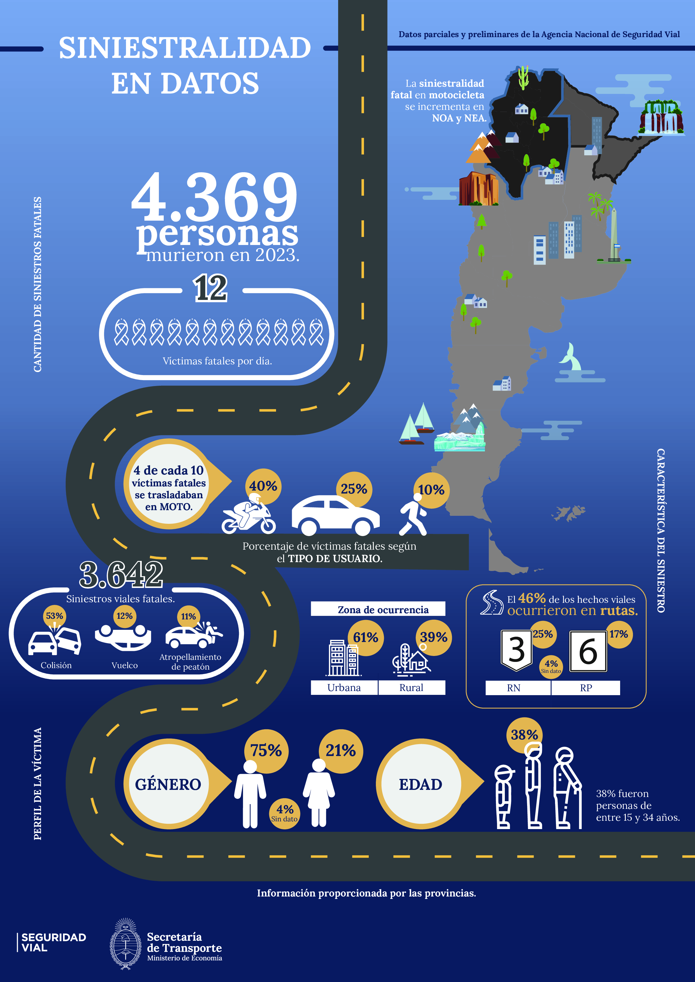 Las estadísticas 2023 oficiales (aunque aún son parciales y preliminares) reflejan que 4.369 personas murieron en 3.642 siniestros viales en todo el territorio nacional. De este total, se desprende que la mayor cantidad de fallecidos fueron motociclistas, siendo 4 de cada 10 de las víctimas fatales (40%). En regiones como en el NOA y en el NEA, la mortalidad de los motociclistas aumenta al 58% y 59% del total de las víctimas, respectivamente.