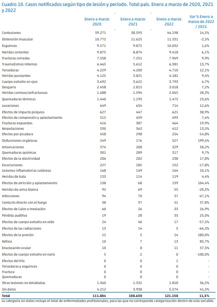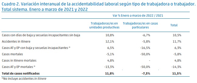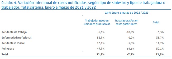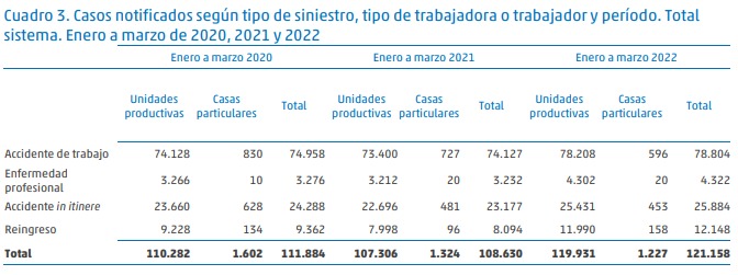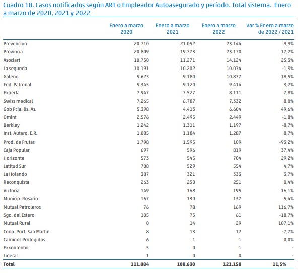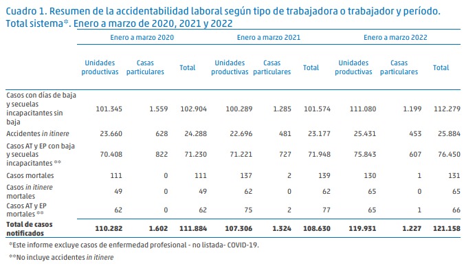 Del mismo se desprende que en dicho período se notificaron un total de 121.158 casos de accidentes de trabajo y enfermedades profesionales, determinando un aumento del 11,5% respecto del primer trimestre de 2021