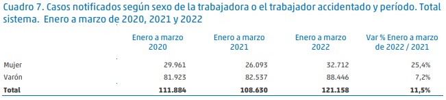 En lo que respecta a casos notificados según el sexo del trabajador, el informe devela que del total de 11.884 casos, 81.923 corresponden a varones y 29.961 a mujeres, con un incremento con respecto al mismo período de 2021 de un 7,2 % y 25, 4 % respectivamente.
