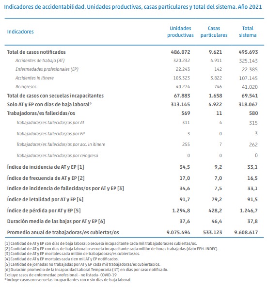 En el año 2021 el total del sistema de riesgos del trabajo cubrió un promedio de 9.608.617 trabajadoras y trabajadores, registró un total de 318.067 accidentes de trabajo y enfermedades profesionales -AT y EP- con días de baja laboral y 318 accidentes mortales en ocasión del trabajo.
