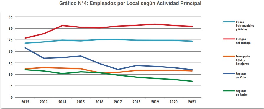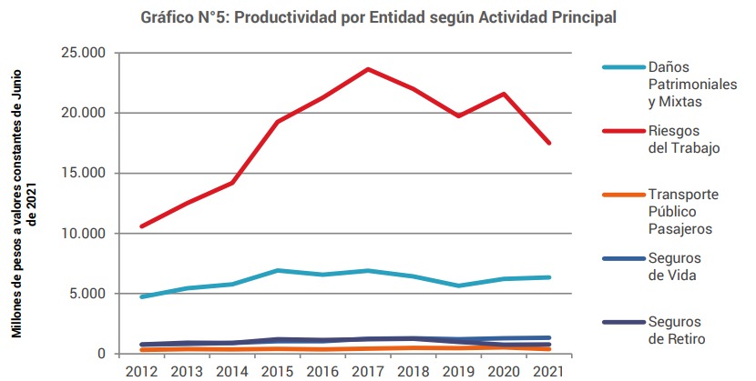 El análisis del Promedio de Empleados por Local según la Actividad Principal de las Entidades indica que se requieren en promedio 31 trabajadores de Seguros de Riesgos de Trabajo para desempeñar tareas, 24 en Entidades Patrimoniales y Mixtas, 12 para Entidades de Seguros de Vida, 11 de Aseguradoras de Transporte Público de Pasajeros y 7 en Seguros de Retiro (Ver Anexo ICuadro N°7, Gráfico N°4). La Productividad del sector se puede medir en pesos por Entidad y pesos por Empleado; en la actualidad, alcanzan los 5.447 millones de pesos y 34 millones de pesos respectivamente. Según la Naturaleza Jurídica la mayor Productividad por Entidad se observa en las Cooperativas y Mutuales con 8.930 millones de pesos, seguida por las Entidades Extranjeras 5.703 millones. Luego, las Sociedades Anónimas que alcanzan los 5.003 millones de pesos y los Organismos Oficiales 2.134 millones. (Ver Anexo I-Cuadro N°4). Según la Actividad Principal, las Aseguradoras de Riesgos del Trabajo producen 17.509 millones de pesos por entidad y las Patrimoniales y Mixtas 6.347 millones. Las Entidades de Vida y de Retiro 1.325 y 779 millones de pesos respectivamente. Por último las entidades de Transporte Público Pasajeros suman 373 millones de pesos (Ver Anexo I - Cuadro N°8, Gráfico N°5).