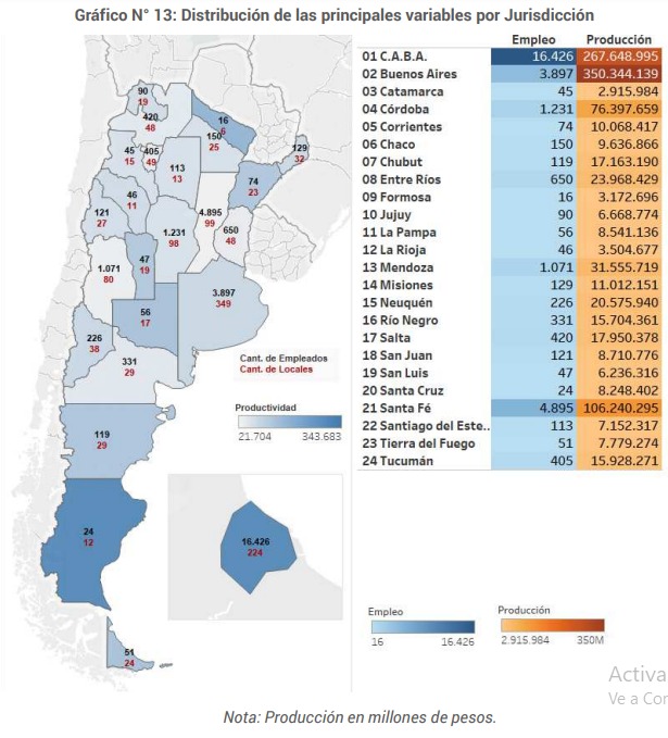 También es importante destacar que 3 de cada 4 empleados Jerárquicos se encuentran en la Ciudad de Buenos Aires (61%) y en la Provincia de Santa Fe (14%), mientras que esas dos jurisdicciones abarcan también a más de 68% del Personal No Jerárquico (Ver Anexo I – Cuadro N° 17). La distribución por Género de los empleados marca, como ya se ha señalado, que hay una mayoría de hombres (54%) frente a mujeres. Estos guarismos, distribuidos por jurisdicción, marcan que, si bien en las provincias con mayor cantidad de locales hay un predominio de varones, existen 7 jurisdicciones en donde hay más mujeres que hombres (Ver Anexo I – Cuadro N° 18). A continuación se puede observar en el Gráfico N° 13, la cantidad de Locales, Empleados, Producción y Productividad por empleado. Esto permite visualizar tanto la operatoria a nivel país como el comportamiento de cada Jurisdicción.