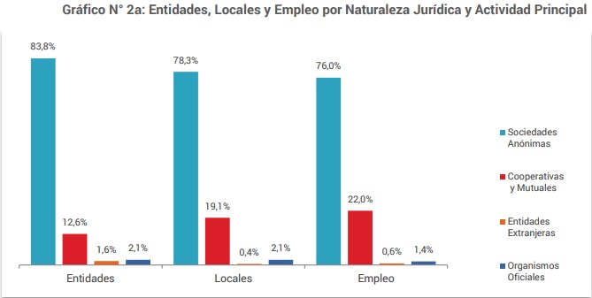 El Empleo total descendió en un 1 % en el último año. En la actualidad, el número de empleados es de 30.633, correspondiendo un 76% a entidades Sociedades Anónimas, un 22% a Cooperativas y Mutuales, mientras que el restante 2% se emplea en Entidades Extranjeras u Organismos Oficiales (Ver Anexo I-Cuadro N°2, Gráfico N°2a).