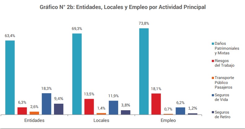La distribución según la Actividad Principal de las Entidades es de un 74% para Patrimoniales y Mixtas, 18% para Riesgos del Trabajo, 6 % para Seguros de Vida y el restante 2% para Seguros de Retiro y Transporte Público de Pasajeros ( Ver Anexo I-Cuadro N°6, Gráfico N°2b).