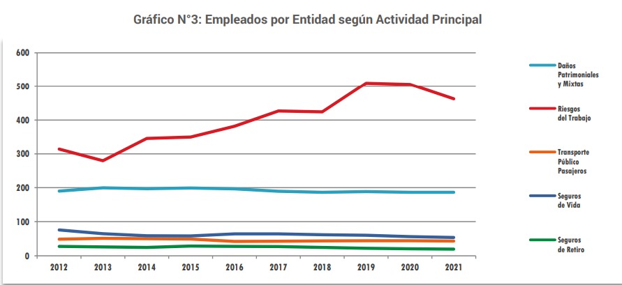 Según la Actividad Principal de las Entidades, las Aseguradoras de Riesgo de Trabajo encabezan este indicador con 463 Empleados por Entidad, seguidos por las Entidades de Seguros de Daños Patrimoniales y Mixtos con 187. Las entidades de Seguros de Vida contribuyen con un promedio de 55 trabajadores, mientras que en los seguros de Transporte Público de Pasajeros y Seguros de Retiro la participación es menor con 44 y 20 empleados respectivamente (Ver Anexo I-Cuadro N°7, Gráfico N°4).