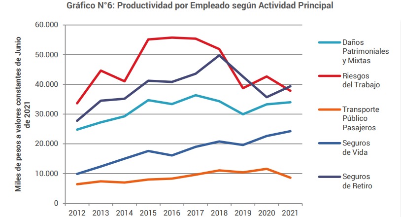 Las Entidades Extranjeras registran la mayor productividad por empleado, más de 87 millones de pesos, seguidas por las Sociedades Anónimas que producen más de 34 millones por Empleado (Ver Anexo I- Cuadro N°4). Las entidades de Seguros de Retiro tienen una productividad superior a los 39 millones, seguidas por las de Riesgos del trabajo con 37 millones. Los empleados de Aseguradoras de Vida Exclusiva y los de Transporte Público Pasajeros producen por Trabajador solamente 24 y 8,5 millones respectivamente (Ver Anexo I-Cuadro N°8, Gráfico N°6).
