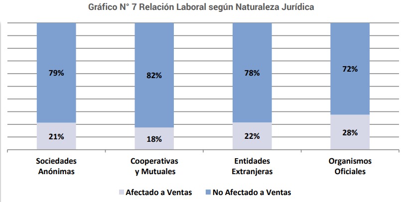 El total de empleados informados es 30.633, en las Sociedades Anónimas, que registran 23.273 empleos, el 79% realiza tareas no afectadas a ventas de seguros, mientras las Cooperativas y Mutuales el 82%, las Entidades Extranjeras el 78% y los Organismos Oficiales el 72%. (Ver Anexo I - Cuadro N°9, Gráfico N°7).