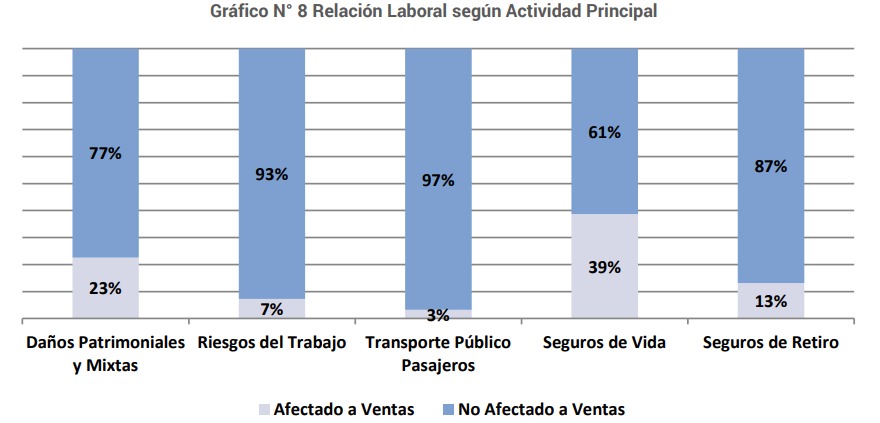 Del mismo modo, según la Actividad Principal, el 77% de los Empleados de las Entidades Patrimoniales y Mixtas son No Afectados a Ventas, mientras en las de Riesgos del Trabajo quienes son No Afectados a Ventas representan el 93%, en las de Transporte Público de Pasajeros el 97%, el 61% en las de Seguros de Vida, y el 87% en las de Seguros de Retiro. (Ver Anexo I – Cuadro N° 11, Gráfico Nº 8).