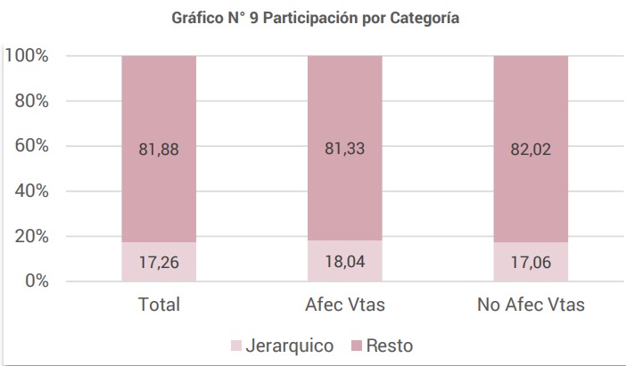 El 99% son permanentes y solamente 264 empleados son temporarios (contratados 58% y pasantes 42%). Del total de empleo permanente el 17% corresponde a cargos jerárquicos. El 79% del total del personal ocupado es No Afectado a Ventas, y el 17% de los mismos cumple tareas jerárquicas, al igual que el 20% del personal Afectado a Ventas (Gráfico Nº 9).