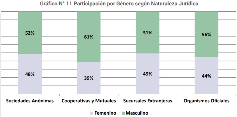 En este análisis se destaca que hay una determinada equidad aunque siempre prevalece el género masculino en la distribución por género. Cuando lo analizamos desde el punto de vista de las entidades por naturaleza jurídica, se observa que, las entidades Extranjeras y las Sociedades Anónimas son quienes tienen mayor porcentaje de personal femenino 49% y 48% respectivamente. En tanto en los Organismos Oficiales ese porcentaje es de un 44% y en las Cooperativas y Mutuales 39% (Ver Anexo I – Cuadro N° 10 - Gráfico Nº 11)