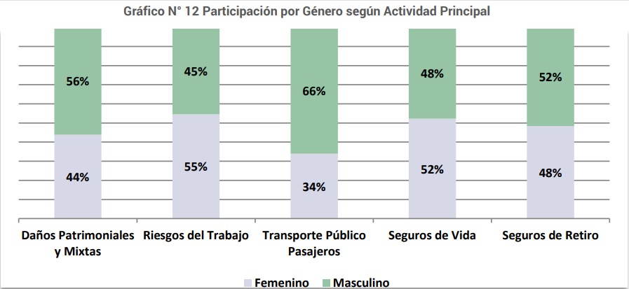 En la distribución por Género según la Actividad Principal de las Entidades, aproximadamente un tercio de los empleados de Transporte Público Pasajeros son mujeres, mientras que en las entidades de Vida y de Riesgos del Trabajo, las mujeres son mayoría con un 52% y 55 % de los puestos respectivamente. En el resto de las actividades continúa la tendencia predominante del Género Masculino (Ver Anexo I – Cuadro N° 12 - Gráfico Nº 12).