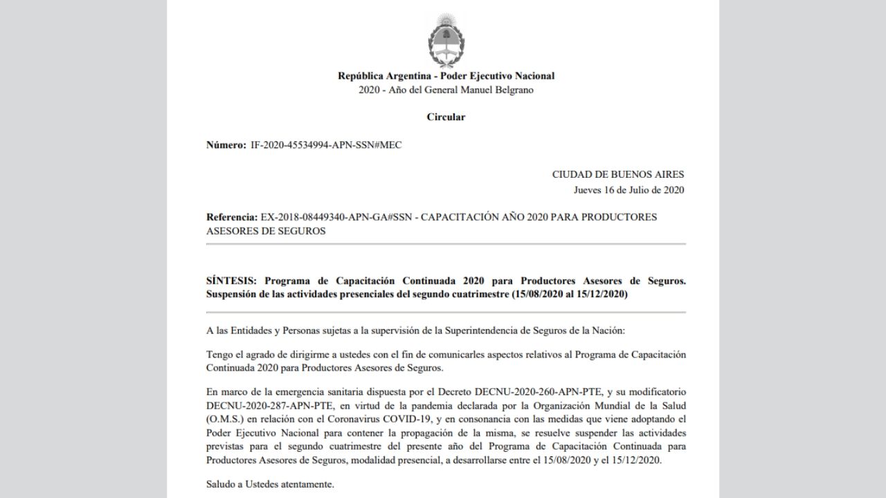 Con fecha 16 de Julio, la Superintendencia de Seguros de la Nación dispuso la suspensión de las actividades previstas para el segundo cuatrimestre del presente año del Programa de Capacitación Continuada para Productores Asesores de Seguros.