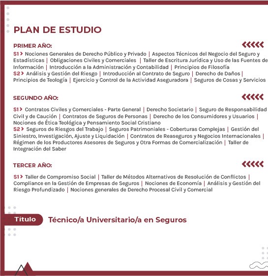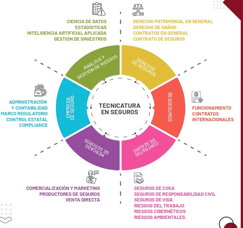 Asimismo, y conforme a los valores que sostiene nuestra casa de estudios, esta tecnicatura aborda también temas vinculados tanto a la función social del seguro como instrumento de protección y resguardo patrimonial de individuos y empresas, como a la importancia que el mercado de seguros como industria representa para la economía de los países proporcionando previsión financiera y fuentes de financiación privada que contribuyen a la solidez de las economías locales.