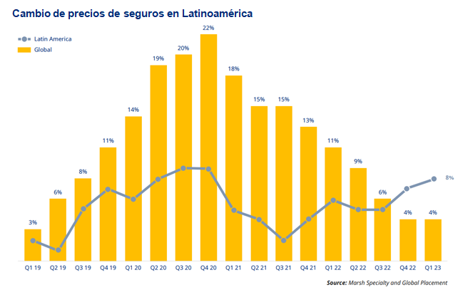 Los precios de los seguros comerciales en América latina aumentaron un 8% en el primer trimestre de 2023, contra el 7% del cuarto trimestre de 2022, es decir tres puntos adicionales del 4% registrado a nivel global, según el Índice del Mercado de Seguros Globales publicado hoy por Marsh, el corredor de seguros y asesor de riesgos líder en el mundo y una empresa de Marsh McLennan. Vale la pena destacar que este primer trimestre de 2023 marca el vigésimo segundo trimestre consecutivo de aumentos de precios.