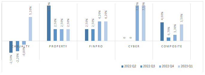 * Los precios de los seguros de responsabilidad civil aumentaron un 10% en el primer trimestre, en comparación con el 8% del trimestre anterior.