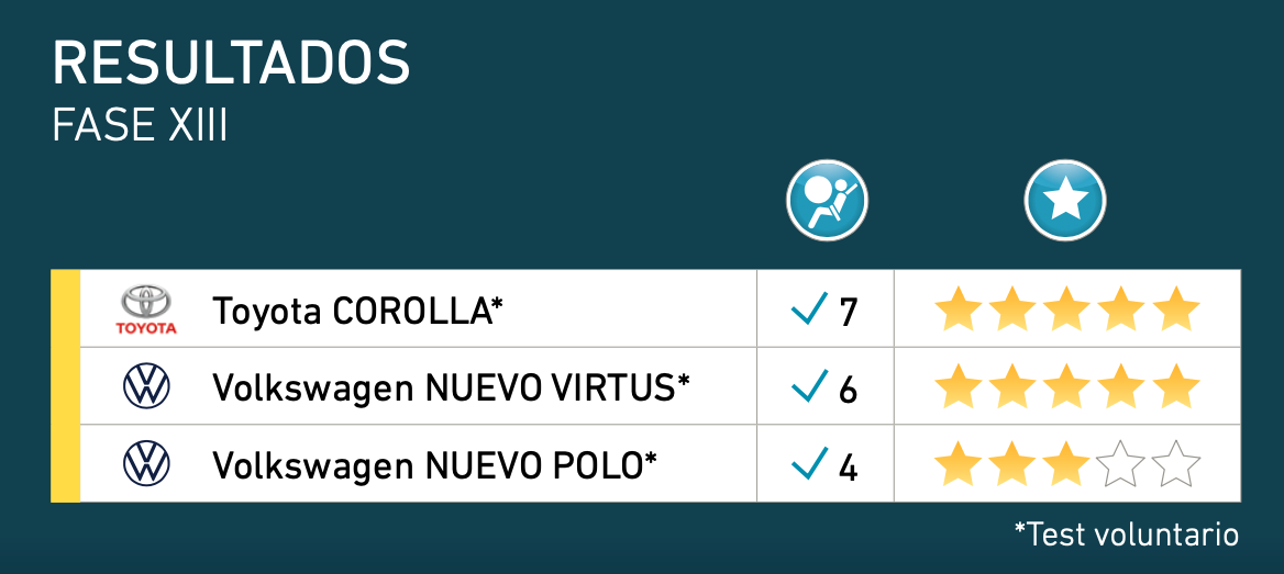 La quinta entrega de resultados del año del Programa de Evaluación de Vehículos Nuevos para América Latina y el Caribe, Latin NCAP, muestra resultados alentadores para el Toyota Corolla y el Volkswagen Nuevo Virtus y tres estrellas para el Volkswagen Nuevo Polo.