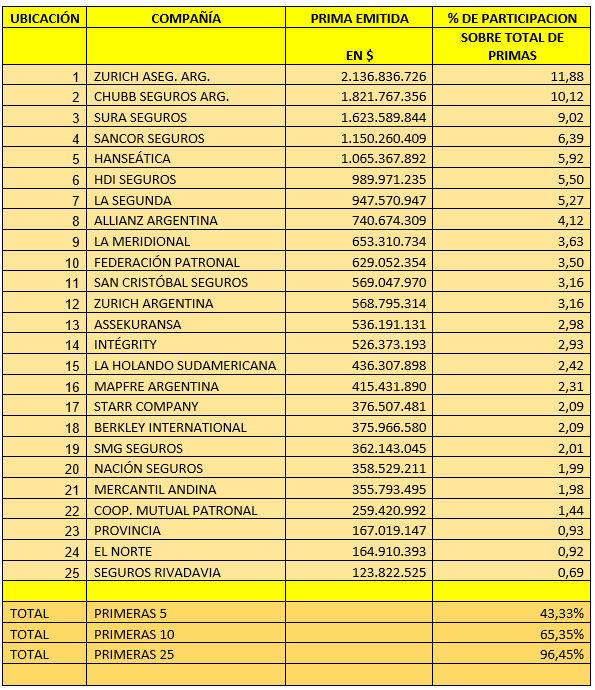 ZURICH ARGENTINA es la aseguradora que lidera el ranking, con una producción de $ 2.136.836.726 y una participación en el segmento del 11,88 %. Ocupan del segundo al quinto puesto CHUBB SEGUROS ($ 1.821.767.356 y 10,12 %), SURA ($ 1.623.589.844 y 9,02 %), SANCOR SEGUROS ($ 1.150.260.409 y 6,39 %) Y HANSEÁTICA ($ 1.065.367.892 y 5,92 %).