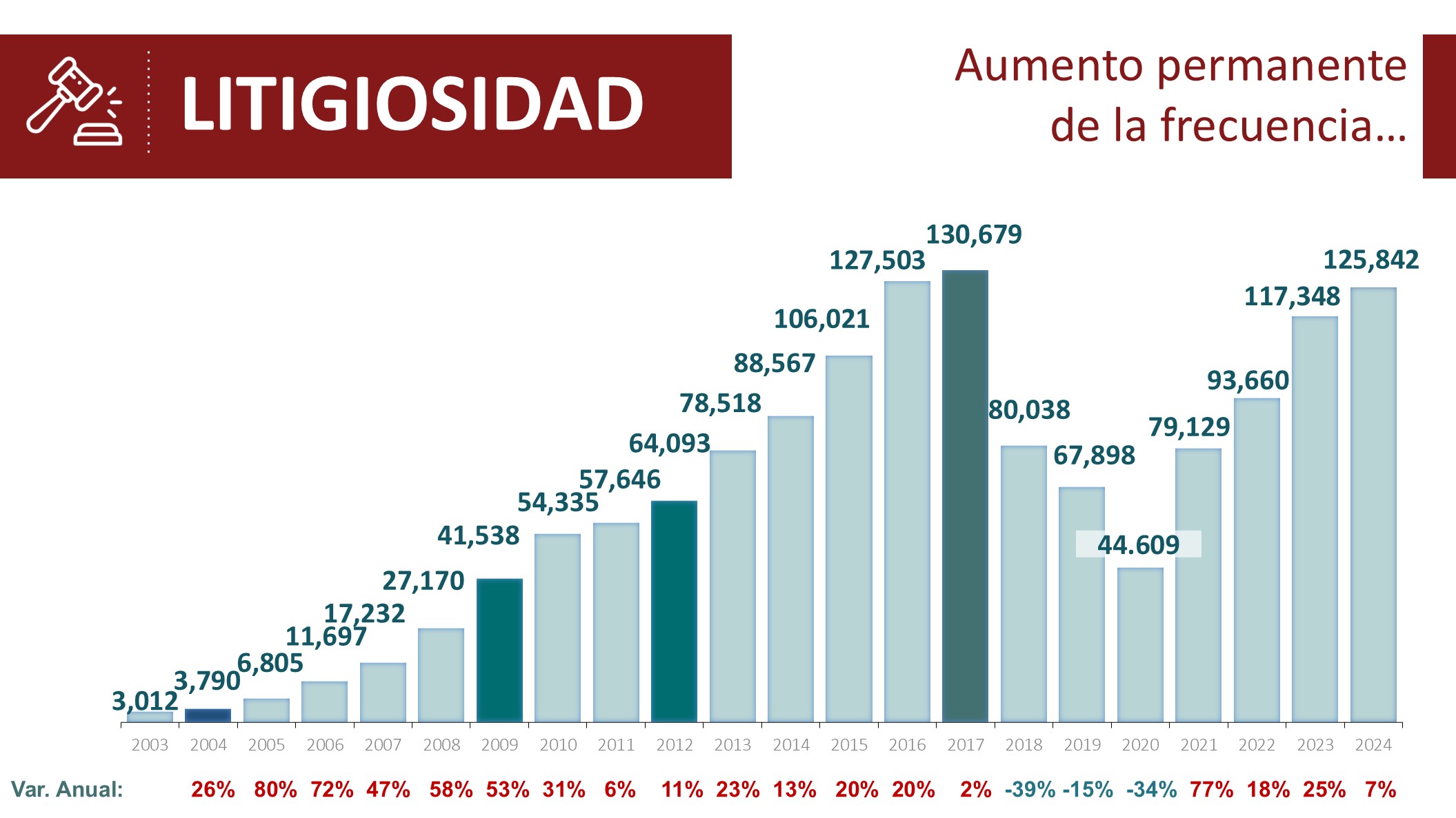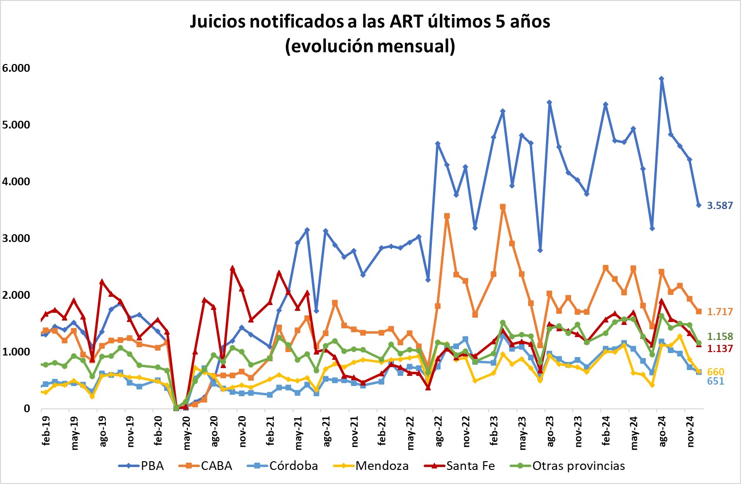 De acuerdo con los datos elaborados por UART, Unión de Aseguradoras de Riesgos del Trabajo, 2024 se consagró como un año de altísima litigiosidad alcanzando un total de 125.842 nuevos juicios laborales, únicamente por Riesgos del Trabajo. Solo en diciembre se iniciaron 8.910 demandas en el país.  La cifra da idea clara del tamaño de la problemática y del desafío a resolver, que no sólo impacta implacable sobre el Sistema de Riesgos del Trabajo, desde la UART se enfatiza también que estos niveles de litigiosidad perjudican a toda la estructura productiva: a los empleadores afectando sus decisiones de inversión y empleo, a los trabajadores bajando sus chances de conseguir empleo y empleo de calidad y a las ART socavando la solvencia del Sistema.