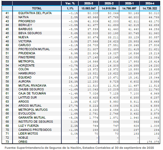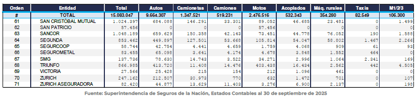 La Superintendencia de Seguros de la Nación a través de la Circular Informativa IF-2025-136472492-APN-GEYE#SSN de fecha 10 de Diciembre de 2025 publicó los Vehículos Expuestos a Riesgo al 30 de Septiembre de 2025.
