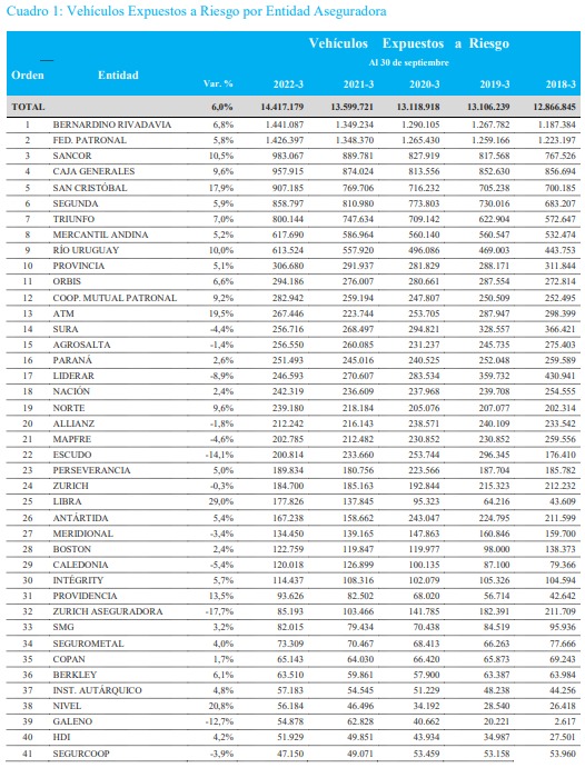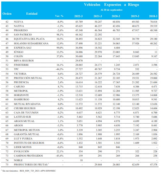 Seguros Rivadavia fue a esa fecha la aseguradora con más vehículos expuestos a riesgo, con 1.441.087, un 6,8 % de incremento al mismo periodo de 2021. La siguieron Federación Patronal con 1.426.397 (5,8 %), Sancor con 983.067 (10,5 %),La Caja Generales 957.915 (9,6 %), San Cristóbal con 907.185 (17,9 %), La Segunda 858.797 (5,9 %),Triunfo 800.144 (7,0 %), Mercantil Andina 617.690 (5,2 %), Río Uruguay con 613.524 (10 %) y cierra el top ten Provincia Seguros con 306.680 (5,1 %) de incremento.