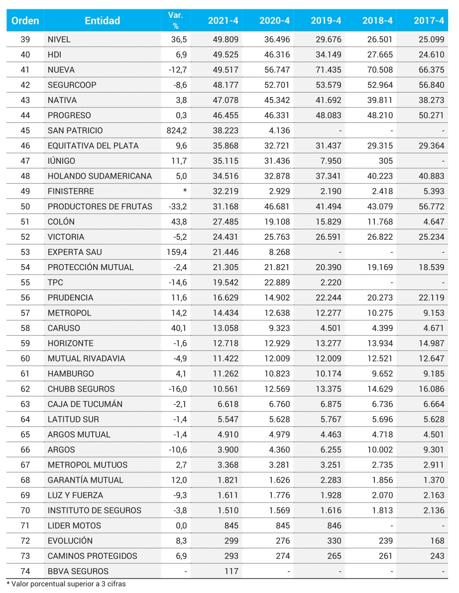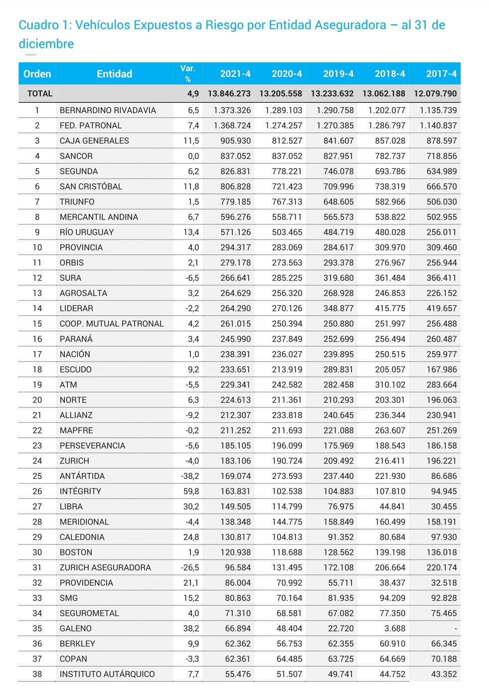 Seguros Rivadavia fue a esa fecha la aseguradora con más vehículos expuestos a riesgo, con 1.373.326, un 6,5 % de incremento al mismo periodo de 2020. La siguieron Federación Patronal con 1.368.724 (7,4 %), La Caja Generales 905.930 (11,5%), Sancor 837.052 (0%), La Segunda 826.831 (6,2%), San Cristóbal 806.828 (11,8 %), Triunfo 779.185 (1,5 %), Mercantil Andina 596.276 (6,7 %), Río Uruguay 571.126 (13,4%) y cerrando el top ten Provincia con 294.37 vehículos (4 % de incremento).