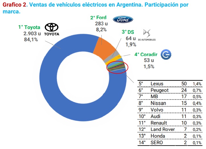 Aun así, los 5 modelos más vendidos representan el 90% de los patentamientos totales. El top líder es Toyota Corolla Cross (55% del total), seguido por Toyota Corolla (22%) y Toyota Rav4 (6%). Recién en el cuarto lugar aparece un vehículo de otra marca, la Ford Kuga (5%) y aparece en el quinto lugar la nueva F-150 híbrida.