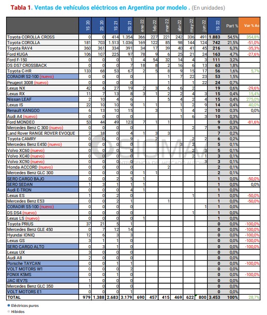 En el primer semestre del año se patentaron en Argentina 3.453 vehículos con motorización no tradicional (82 eléctricos puros y 3.371 híbridos). Esta cifra es 274 unidades más alta que el registro del mismo período del año pasado (+28,7%).
