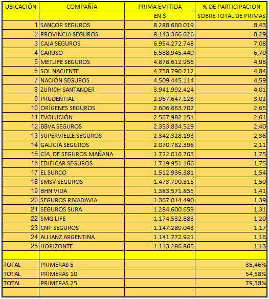 Si tomamos en consideración las 10 primeras aseguradoras el porcentaje alcanza al 54,58 % y si ampliamos la participación de las primeras 15 las mismas alcanzan el 79,38 % del total de la producción.